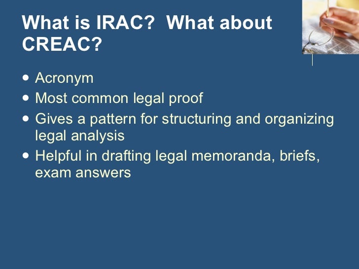 Legal analysis & the irac method your eyes quickly glazed over. It is one way to structure legal irac is an extremely useful tool in organizing any law related essay answer. Looking for online definition of irac or what irac stands for? Irac is listed in the world's largest and most authoritative dictionary database of abbreviations and acronyms. The issue is, what does irac mean, and what are the legal issues in case?